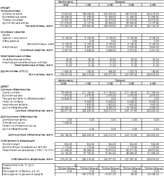 Общая величина дебета баланса составила в 2008 году 179 347,00 тыс. грн. и будет равна кредиту баланса. Прогнозные данные по дебету и кредиту баланса также совпадают. Таким образом, расхождения по балансу будут равны нулю. Баланс предприятия положительный.