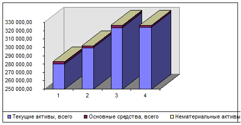 Проанализировав диаграмму, можно сделать вывод, что наибольшую часть активов предприятия составляют текущие активы, что свидетельствует о ликвидности баланса. Наименьшую часть в активах предприятия составляют нематериальные активы, их величина в течение года не изменяется.