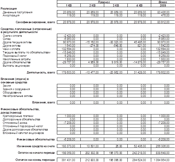 Таким образом, изменение средств на счете, которое рассчитывается как сумма средств от реализации, средств от основной деятельности, вложений основных средств и финансовых обязательств, составит в 2009 году 256306,00 тыс. грн.