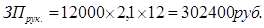 Заработная плата руководителя складывается из оклада и премии. Оклад руководителя составляет 12000 руб. в месяц, премия - 110%. Таким образом, заработная плата руководителя равна: