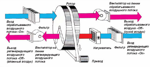 Осушитель конденсационного типа состоит из компрессорной холодильной установки, используемой для создания охлажденной поверхности, и вентилятора, подающего воздушные массы на эту поверхность для обеспечения контакта с ней влажного воздуха. Воздух, прошедший через систему осушения и, следовательно, утративший определенную часть содержащейся в нем влаги, вновь подается в помещение и смешивается с находящимся в нем воздухом. Таким образом, абсолютная и относительная влажность воздуха в помещении постепенно снижаются.