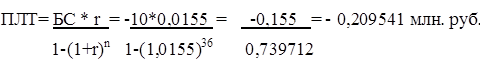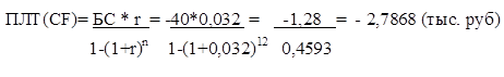 ПЛТ(3,2%;12,0;-40)=2,7868 тыс. руб.