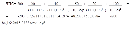 ЧПС(13,5%;20;40;50;80;100)-200=15,8333 млн. руб.