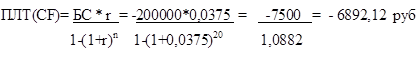 ПЛТ(3,75%;20,0;-200000)= руб.
