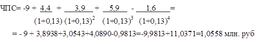 ЧПС(13%;4,4;3,9;5,9;-1,6)-9=1,0558 млн. руб.