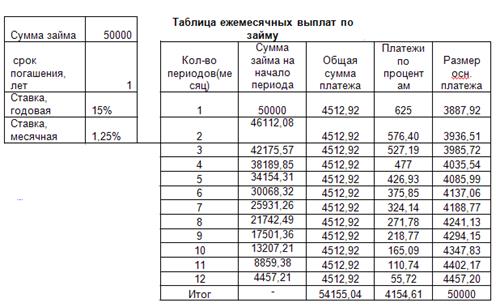 ПЛТ(15%/12;12;-50000)=4512,92 руб. Ежемесячная выплата