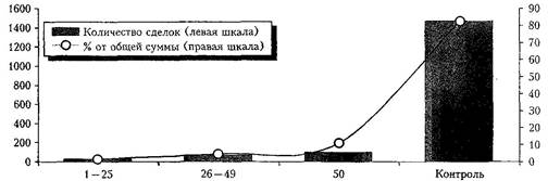На рынке слияний и поглощений доля такой формы интеграции предприятий, как получение полного контроля над компанией, в общем количестве сделок за весь рассматриваемый период достигла 88,2%, в стоимостном выражении — 82,45%. Число сделок по приобретению «половины» объекта (либо 50% акций, либо половины доли в уставном капитале) составляет 5,8% общего числа сделок, или 6,4% в стоимостном выражении. Приобретение блок-пакета акций, или 26—49% компании, встречается в 4,3% сделок (в стоимостном выражении — 4,6%). Доля 1—25% приобреталась в 1,6% сделок (в стоимостном выражении — 1,8%). Динамика количества сделок в зависимости от выкупаемой доли представлена на рис. 3.