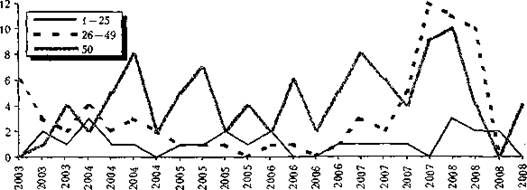 Рис. 3 Динамика количества сделок в зависимости от выкупаемой доли, 2003-2008 гг. (в %) [10, с.28]