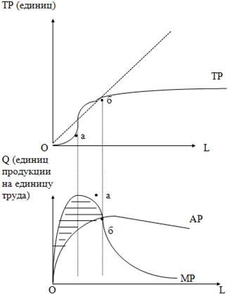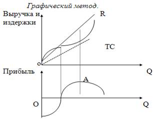 Прибыль максимальна в точке А, когда расстояние между кривыми R и TC самое большое, или когда угловой коэффициент R = угловому коэффициенту ТС. Таким образом, прибыль максимальна, когда предельный доход фирмы равен предельным издержкам производства.