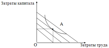 Точка А является точкой, в которой издержки фирмы будут минимальными. В этой точке наклон изокосты и наклон изокванты равны. Известно уже, что наклон изокванты равен MRTS, а наклон изокосты PL