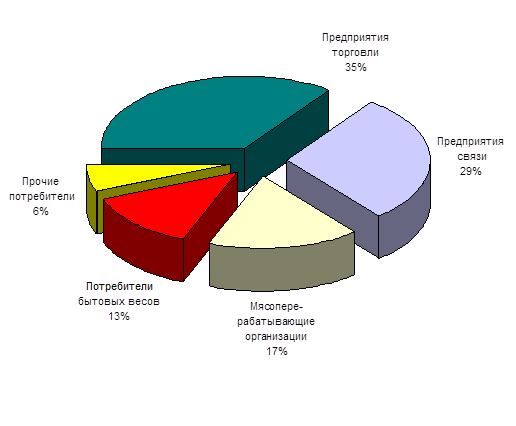 Весоизмерительная техника, выпускаемая РУП «Зенит» поставляется в основном на рынок Республики Беларусь – 96% от общего объема производимой продукции и Российской Федерации – 4%. Интересным представляется рассмотрение структуры потребителей продукции РУП «Зенит» в Республике Беларусь, представленной на рис. 4.
