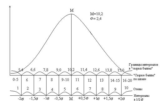 Принцип построения большинства интервальных шкал построен на известном правиле "трех сигм": примерно 97,7-97,8% всех значений признака при нормальном его распределении укладываются в диапазоне М±Зσ[1]