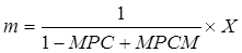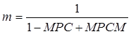 Однако многократное изменение У в свою очередь связано с изменением объема импорта. Это означает, что в случае возрастания У в результате положительного прироста экспорта, будет наблюдаться прирост импорта. Увеличение импорта действует аналогично как и увеличение сбережений, т.е. способствует сжатию У, поскольку рост импорта означает сокращение совокупного спроса на национальную продукцию. Поэтому мультипликатор внешней торговли отражает в себе как МРС, так и МРСМ, т.е.