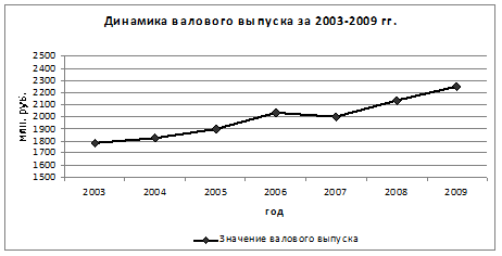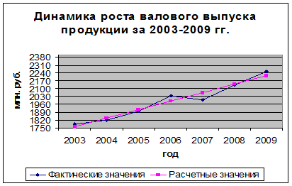 График динамики фактического и расчетного значений валового выпуска продукции за 2003-2009 гг.