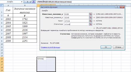 С помощью линейного уравнения, описывающего динамику валового выпуска за 2003-2009 гг., определяем расчетные значения показателя у (валового выпуска) на два года вперед (на 2010 и 2011 годы).