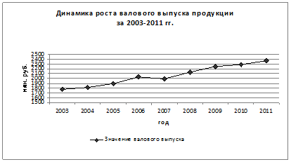 В общем динамика роста валового выпуска продукции за 2003-2009 гг. положительная, что отчетливо видно на графике. В будущем (2 года), на основе рассчитанных данных, будет также наблюдаться положительная динамика роста валового выпуска продукции предприятия. Построенная линейная функция является адекватной, что подтвердили расчеты и выводы всех показателей.
