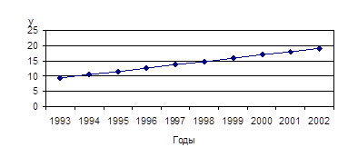 2.1 Установить характер изменения объёма производства продукции в 1993-2002 годах,построив на поле графика эмпирическую кривую уровней ряда динамики. Определить тип кривой, описывающей изменение объёмов производства продукции за 1993-2002 годы.