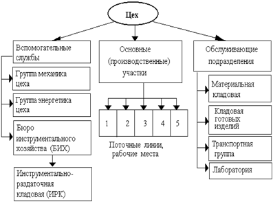 Цех - это основная структурная производственная единица предприятия, административно обособленная и специализирующаяся на выпуске определенной детали или изделий либо на выполнении технологически однородных или одинакового назначения работ. Цехи делятся на участки, представляющие собой объединенную по определенным признакам группу рабочих мест. Производственная структура цеха показана на рис. 1.1.