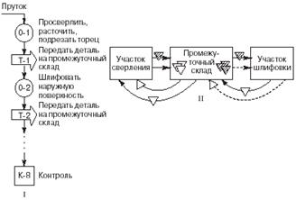 Рис. 3.1. Схема организации синхронизированного производства: I - маршрутная схема производственного процесса; II - схема движения контейнеров с картами "канбан"