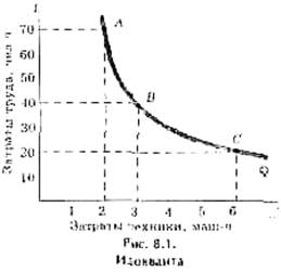 На рис. изображена изокванта, соответствующая производству 1 т картофеля. Она показывает, что существует много вариантов использования ресурсов для производства данного объема картофеля. В одном случае может быть использовано больше ручного труда (L) — 70 чел-ч и лишь 2 машино-часа (К) (точка А), в другом — 40 чел-ч L и 3 К (точка В), в третьем — 20 чел-ч L к 6 ч К (точка С) и т.д.
