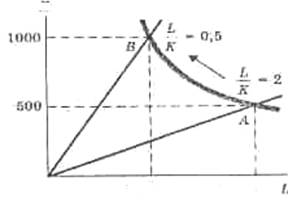 Предположим, что технология производства одного автомобиля предусматривает использование 1000 ч труда и 500 ч работы станков и оборудования. Отношение труда к капиталу при этом составит 2 ч труда к 1 ч работы машин (точка А).