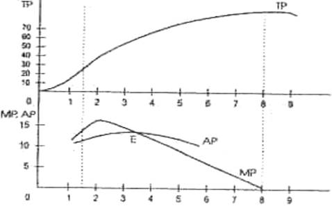 Предельные издержки связаны с действием закона убывающей отдачи. Если предположить, что каждая единица переменного фактора приобретается по фиксированной цене, то МС на производство каждой дополнительной единицы продукции будут падать до тех пор, пока предельная производительность каждой дополнительной единицы переменного ресурса будет возрастать. Падение предельной производительности вызовет рост предельных издержек. На графике в точке Е, где предельные издержки минимальны, предельная производительность достигнет своего максимального значения.
