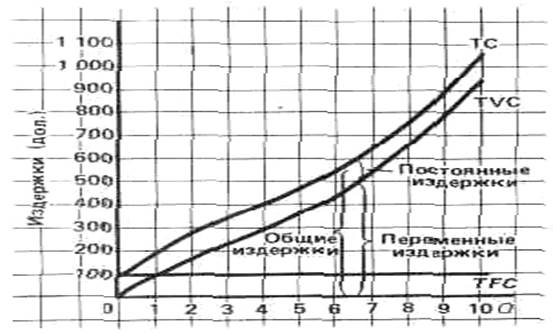 Общая сумма издержек. Термин "общая сумма издержек" говорит сам за себя: это сумма постоянных и переменных издержек при каждом данном объеме производства. В таблице она показана в колонке 4. При нулевом объеме производства общая сумма издержек равна сумме постоянных издержек фирмы.