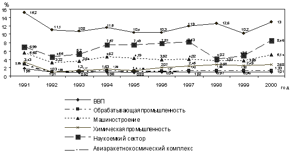 Динамика объемов наукоемкого сектора российской промышленности во многом коррелирует с темпами падения или роста выпуска оборонно-промышленного комплекса, а расхождение объясняется за счет роста продукции атомного комплекса и наукоемкой части химической промышленности.