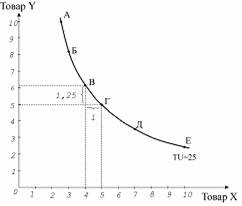 Рухаючись вздовж обраної кривої байдужості, споживач залишається на одному і тому ж рівні корисності, але може змінювати набір товарів у кошику. Опуклість кривих байдужості до початку координат означає, що збільшення в кошику кількості одного товару супроводжується зменшенням кількості іншого, тобто споживач може лише замінювати один товар іншим.