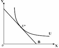 За ординалістською версією оптимізація споживчого вибору полягає у суміщенні „моделі бажаного” та „моделі можливого” і пошуку оптимального кошика, який повинен належати бюджетній лінії, але в той же час найповніше задовольняти уподобанням споживача, тобто досягати найвищої з можливих кривих байдужості. Таке поєднання одержимо, сумістивши карту байдужості з графіком бюджетної лінії, як це зображено на рис. 2.7. Найвищою з доступних споживачеві кривих байдужості є, яка лише дотична до бюджетної лінії. Оптимум знаходиться в точці.