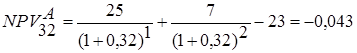 Розрахунок чистої приведеної вартості для проекту А при ставці дисконту 32%: