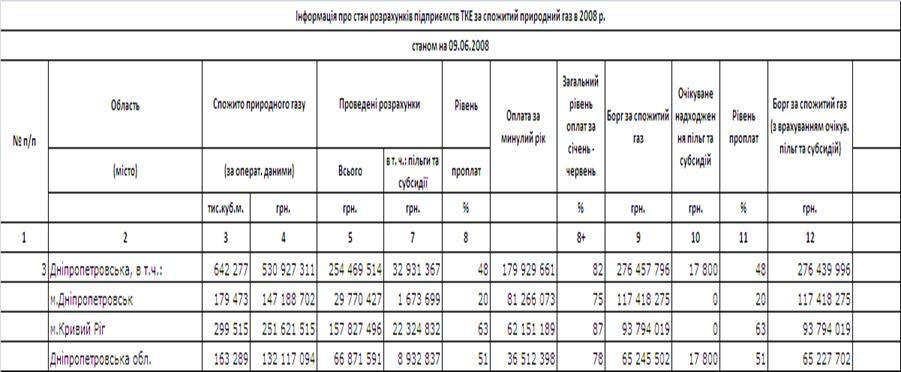 Рівень оплати у 2008 році за постачання газу у Дніпропетровській області підприємствами топливно-енергетичного комплексу по конкуруючим компаніям ВАТ «Дніпропетровськгаз», ВАТ «Дніпрогаз», ВАТ «Криворожгаз»