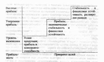 Убыточные предприятия стремятся выжить за счет производства новой прибыльной и конкурентоспособной продукции; предприятия со средней нормой прибыли с помощью диверсификации стараются поддержать установившуюся финансовую стабильность, а у преуспевающих фирм приоритеты целей смещаются в сторону экономической экспансии и завоевания новых рынков [1, с.145].