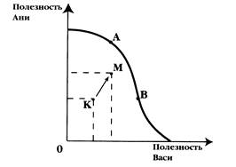 На рисунке изображена кривая достижимой полезности в обществе, состоящем из двух индивидуумов - Ани и Васи. Мы можем утверждать, что, если происходит перемещение из точки К в точку М, то наблюдается улучшение по Парето. Произошло увеличение полезности и Ани, и Васи. Но перемещение из Л в В или наоборот, т. е. скольжение вдоль кривой достижимой полезности, не может ничего нам сказать о более предпочтительном (с точки зрения справедливости) положении каждой из указанных точек.