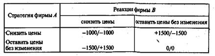 Если фирма А решит снизить цены и фирма В последует за ней, прибыль фирмы А сократится на 1000 тыс. грн. Если фирма А снизит цены, а фирма В не сделает того же, то прибыль фирмы А возрастет на 1500 тыс. грн. Если фирма А не предпримет никаких шагов в области цен, а фирма В снизит свои цены, прибыль фирмы А сократится на 1500 тыс. грн. Если обе фирмы оставят цены без изменений, их прибыли не изменятся. [1]