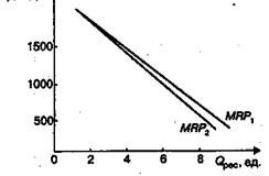 Рис. 5.1. График предельной доходности ресурса для фирмы в условиях совершенной и несовершенной конкуренции на рынке готовой продукции: МRР1, МRР2 - предельные доходности соответственно в указанных условиях; Qрес - количество используемого ресурса; Qрес - цена ресурса