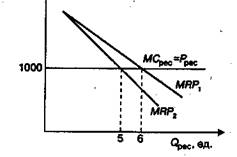 Принцип выбора фирмой количества используемого ресурса аналогичен принципу определения оптимального объема выпуска продукции. Для фирмы будет прибыльным увеличивать количество используемого ресурса до точки, где его предельная доходность будет равна предельным издержкам на этот ресурс (рис. 5.2). В рассматриваемом примере при цене ресурса 1000 грн. фирма в условиях совершенной конкуренции на рынке готовой продукции будет использовать 6 ед. данного ресурса (график предельной доходности МRР1), а в условиях несовершенной конкуренции - только 5 ед. (график предельной доходности ресурса МRР2).