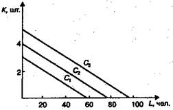 На рис. 5.3 изображены три графика, соответствующие трем вариантам общих издержек фирмы. Например, график С1 показывает все возможные сочетания машин и ручного труда, которые обходятся в 60 тыс. грн.; С2-в 80 тыс. и С3-в 100 тыс. Наклон графиков зависит от соотношения цены на машину и заработной платы дворника.