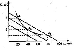 Рис. 5.3. Возможные сочетания двух ресурсов при их одинаковой суммарной стоимости: К- число снегоуборочных машин; L - численность дворников