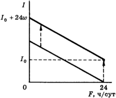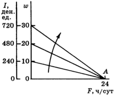 Свободный член (24w) задает точку, в которой бюджетная линия пересекает ось ординат. В этой точке, т. е. рабочий день индивида равен 24 ч. Ось абсцисс бюджетная линия пересекает в точке, где F = 24.
