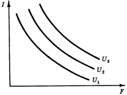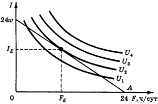 Аппарат кривых безразличия, использованный нами при анализе потребительского поведения, может оказать нам большую услугу и при анализе распределения времени между работой и досугом. На рис. 1 изображена карта кривых безразличия для дохода и досуга. По оси ординат откладываем величину ежедневного дохода (I), по оси абсцисс - величину досуга (F). Чем дальше находится кривая безразличия от начала координат, тем больший уровень полезности ей соответствует. На рис. 1 показаны только три из бесконечного множества кривых безразличия.