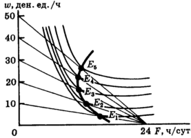 Будем считать, что все основные свойства кривых безразличия имеют место и для предпочтений в отношении дохода и досуга. В частности, каждая кривая обращена выпуклостью к началу координат. Если у человека мало досуга, то норма замещения досуга доходом относительно велика: сокращение досуга на один час в сутки требует для сохранения уровня удовлетворения значительной прибавки дохода. В левой части карты безразличия кривые имеют крутой наклон. Если же у человека досуга много, то он ценит дополнительный час ниже, и по мере движения вдоль кривой безразличия слева направо наклон ее снижается [10].