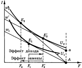 В соответствии с равенством Слуцкого изменение индивидуального выбора при этом разлагается на две составляющие: эффект дохода и эффект замены. Под эффектом дохода понимают изменение объема предложения, вызываемое изменением дохода без изменения ставки заработной платы. Под эффектом замены - изменение объема предложения труда, вызываемое изменением ставки заработной платы без изменения степени удовлетворения индивида.