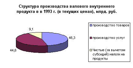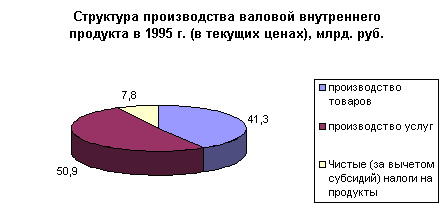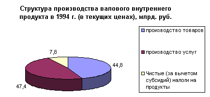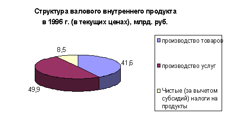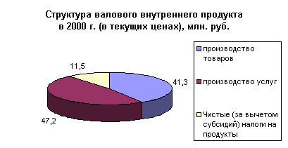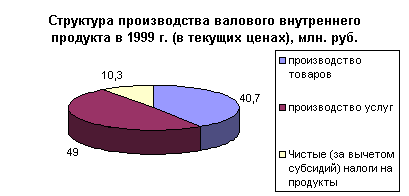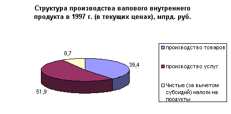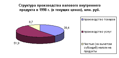 В структуре производства валового внутреннего продукта за период с 1992 по 2000 год наблюдается тенденция к уменьшению удельного веса производства услуг и товаров. Доля услуг в 1997 году составила 51,9 % против 50,7 % 1992 году, а доля производства товаров уменьшилась с 47,5 % в 1992 году до 39,4 % в 1997 году. В 1998 году значительных изменений в структуре производства валового внутреннего продукта. Также в структуре произведенного валового внутреннего продукта в 1997 году значительно сократился удельный вес практически всех отраслей экономики, производящих товары (на 2,2%). Это связано с повышение доли производства услуг при сокращении спроса на продукцию этой сферы деятельности явилось, прежде всего, отражением спада деловой активности в остальных отраслях. С другой стороны, рост доли услуг обусловлен также позитивными структурными изменениями в этом секторе экономики. Растет, в частности, доля связи, торговли, операций с недвижимостью, финансово-кредитных и страховых услуг и других их видов, имеющих, прежде всего, рыночный характер. В 1999 и 2000 годах наблюдается рост объема производства товаров и снижение роста производимых услуг. А что касается соотношения доли товаров и услуг в структуре производства валового внутреннего продукта, то оно не претерпело значительных изменений. В 1999 году производство товаров составило 40,7 %, а услуг 49 %. В 2000 году доля производимых товаров в структуре производства валового внутреннего продукта равна 41,3 %, а доля услуг 47,2.
