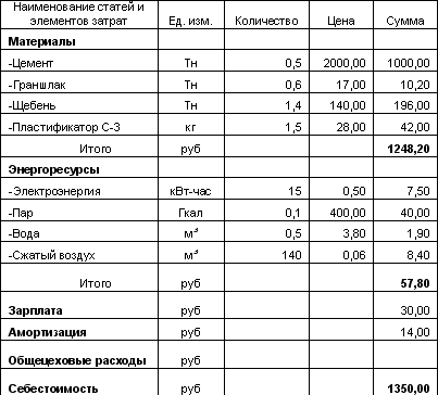 Рассмотрим калькуляцию на изготовление продукта - 1 м3 сборного железобетона (плиты), производимого на основе технологического бетона себестоимость, которого составляет 1350,00 руб.