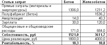 Для того чтобы оценить рентабельность производства, принимаем, что цена реализации бетона и сборного железобетона составляет 1800,00 руб. и 4000,00 руб. соответственно. Получаем, что рентабельность бетона составляет 12,5%, железобетона -19%.