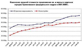 В первом полугодии 2008 г. во всех городах Поволжья наблюдалось сохранение положительной динамики цен на качественное вторичное жилье и новостройки. В регионе продолжается постепенное увеличение покупательской активности. В настоящее время рынок недвижимости городов Приволжского федерального округа можно охарактеризовать как стабильный (почти для всех городов характерен небольшой рост цен на качественное вторичное жилье и новостройки), наблюдается постепенное увеличение покупательской активности. В июле 2008 г. средняя цена на рынке вторичной недвижимости в городах Приволжского федерального округа составила более 58,000 руб./кв. м, на рынке первичной недвижимости около 50,000 руб./кв. м.