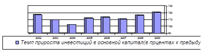 Начиная с 2005-2006 года, рост ВВП, в большей степени приобретает очертания инвестиционного характера, о чем свидетельствует темп прироста инвестиций в основной капитал (рис.2), который также составлен по индексам физического объема, в процентах к предыдущему году.