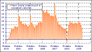 Касаемо инвестиций в основные фонды, даже в условиях проблем с привлечением внешнего финансирования прирост инвестиций в основной капитал превышает 15% в начале 2009 г. (рис 2.9)