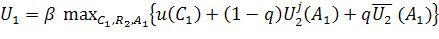 где c1 - потребление в период 1, пожизненная полезность, когда рабочий находится в работе в начале периода 2 (данная в этом случае β(1+β)u(Cj